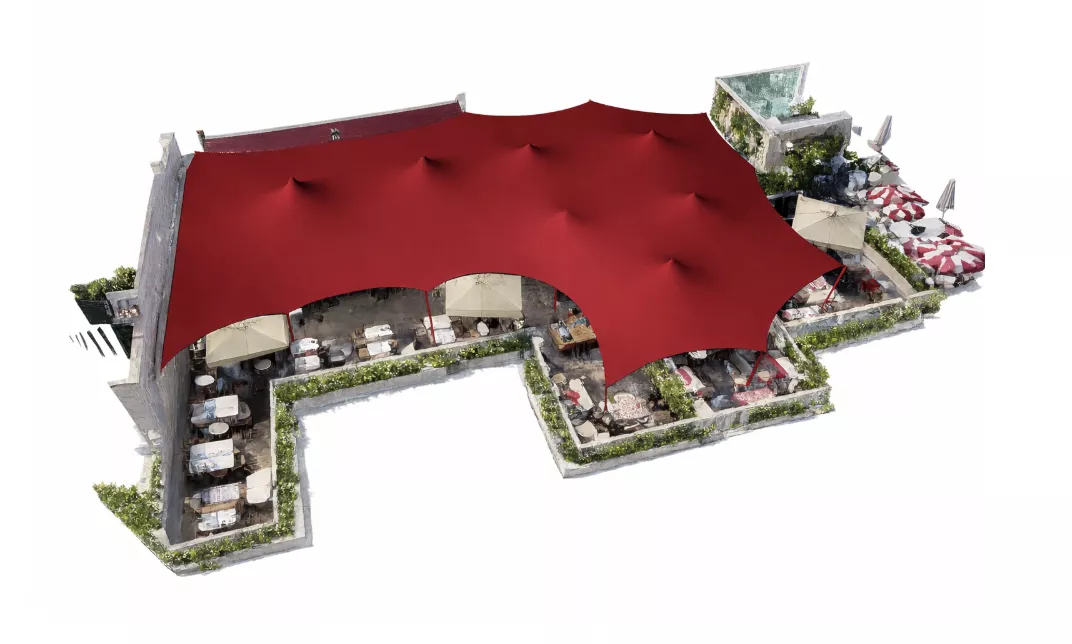 La Silhouette peut être combinée à des zones Stretch, créant des espaces lounge ou ombragés parfaitement intégrés à l’environnement.